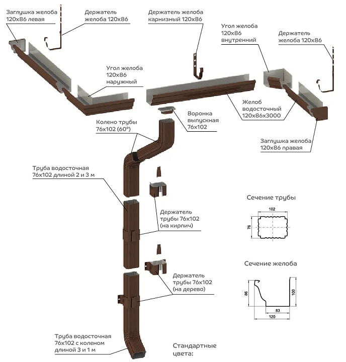 Водосточная система Бюджет 120*86 ― экономичное решение для частного дома. Этот базовый вариант доступен почти каждому домовладельцу. Прямоугольные желоба сечением 120*86 мм более глубокие, чем круглые с похожими параметрами. Они оперативно отводят воду, переливов не будет.